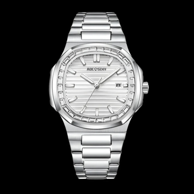 O Momentum Rhinestone combina o requinte da relojoaria de precisão com o brilho sutil de pedras lapidadas, criando uma peça que atrai olhares e transmite distinção sem excessos.
